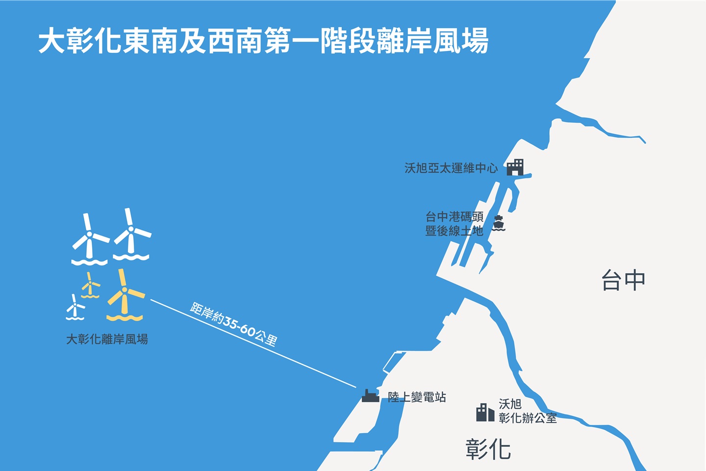 大彰化東南及西南第一階段離岸風場位於彰化外海35至60公里處,是台灣第一座位於航道外的大規模遠岸風場,預定2022年完成建造,屆時可提供乾淨能源給一百萬台灣家庭。