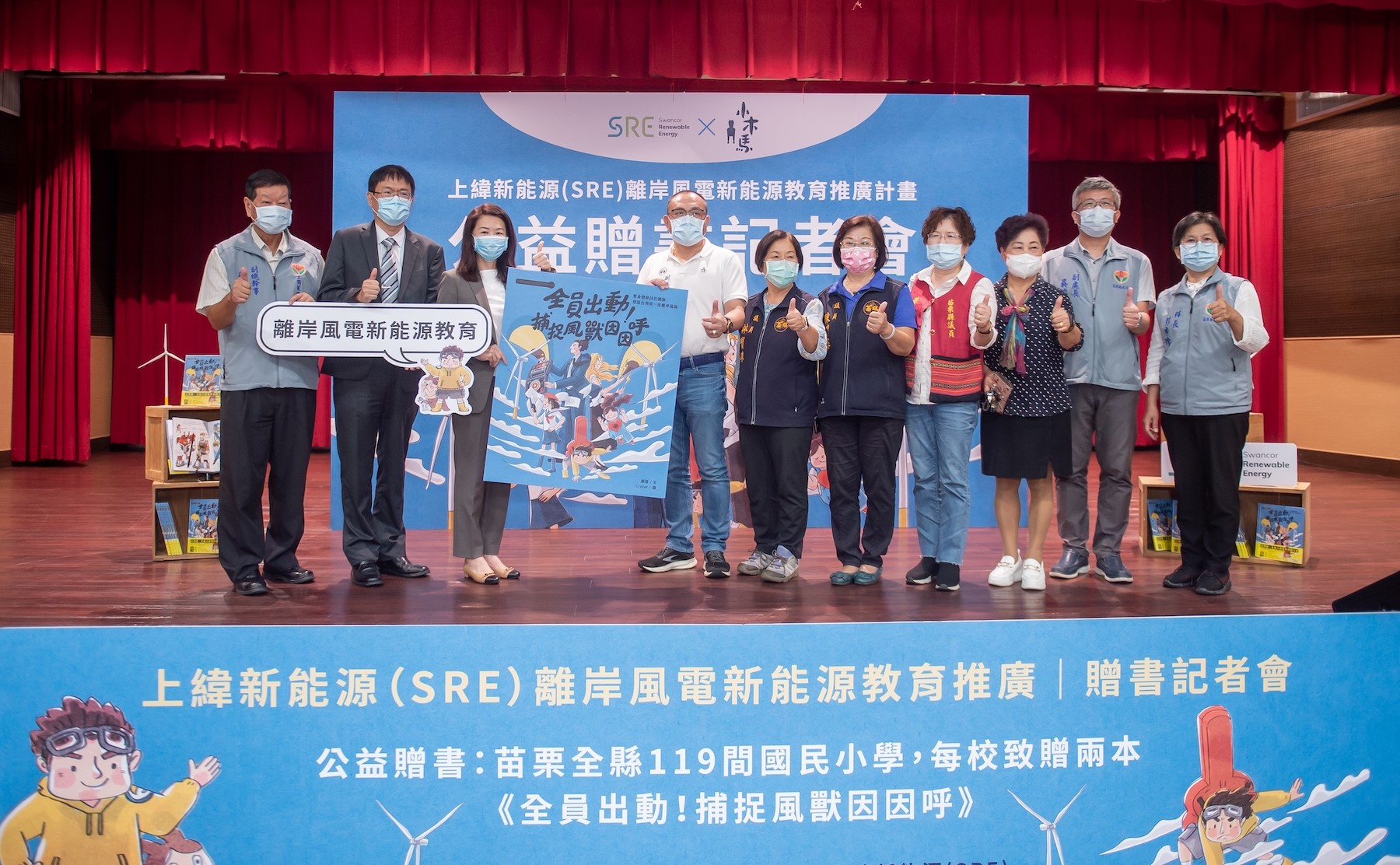 上緯新能源(SRE)啟動「離岸風電新能源教育推廣計畫」,不但策畫台灣第一本以離岸風電為主題的繪本《全員出動!捕捉風獸因因呼》,更捐贈全苗栗縣境內之119 所國小,每校圖書館兩本全新出版的離岸風電知識圖文繪本。此外,上緯新能源團隊也將前進苗栗小學校園,透過說故事、互動教學等各種活潑有趣的方式,將新能源教育與環保意識扎根到每個苗栗小朋友的心中。