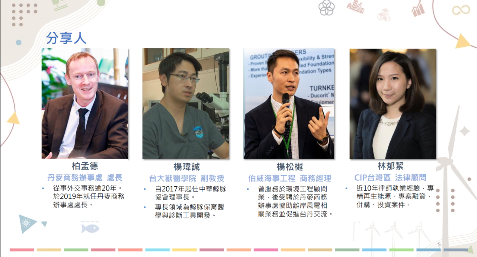 由丹麥商務辦事處主辦及哥本哈根基礎建設(以下稱CIP)協辦之第二場「能源轉型與環境永續系列沙龍」於昨(3)日下午兩點舉行;線上邀請到丹麥商務辦事處處長伯孟德、國立台灣大學獸醫專業學院副教授楊瑋誠、柏崴海事工程股份有限公司商務經理楊松樾,以及CIP台灣區法律顧問林郁絜,共同分享:丹麥觀察:全世界最幸福的國家、生物多樣性實踐—中華白海豚之保育、離岸工程海底減噪—什麼是雙層大氣幕工法,以及IFC環境與社會績效標準之應用等議題。