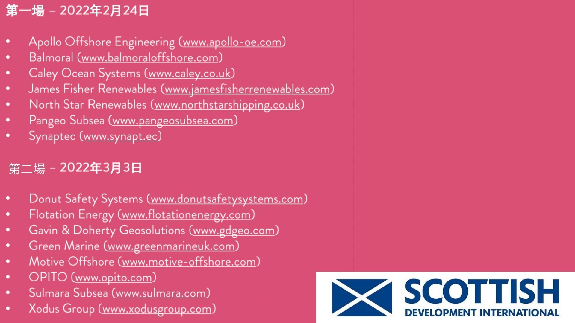因此,我們將於02月24日和03月03日組織兩場線上說明會, 邀請這15家蘇格蘭公司提前向台灣風電業者自我介紹,隨後再由蘇格蘭政府國際發展局的駐台官員協助安排一對一會議,或於展覽現場的蘇格蘭館進一步代爲洽談。