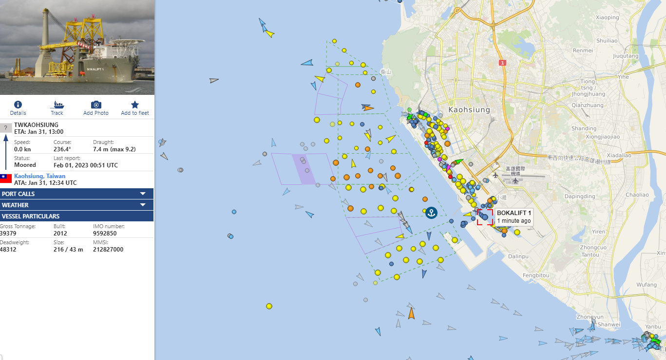 據礙航布告資訊顯示,彰芳西島風場水下基礎安裝施工範圍公包含 52 個施工點位,並將由荷蘭海事工程公司 Boskalis 旗下重型起吊船 Bokalift 1 及半潛式重載船 Mighty Servant 3 等船舶進行海上工程,日前 Bokalift 1 也已於 1 月 28 日抵達台南安平港,並在 31 日抵達高雄。