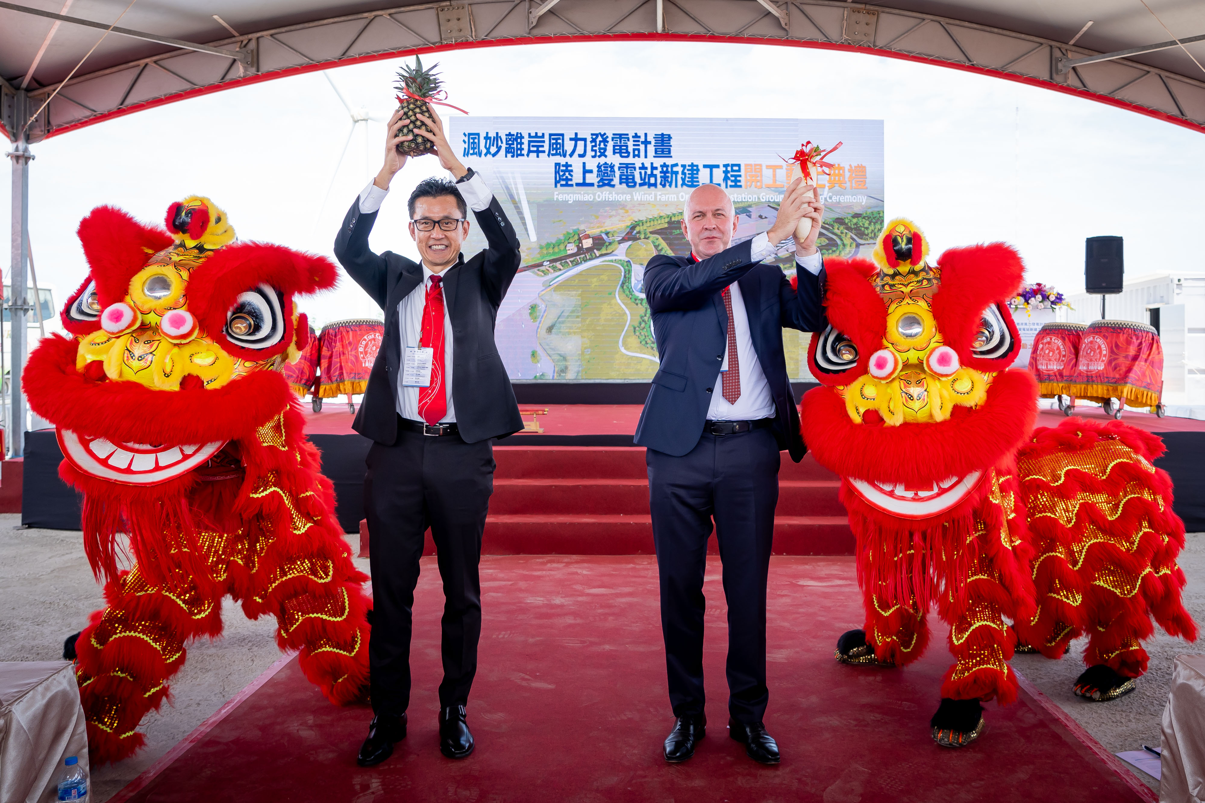 渢妙離岸風場執行長 Mark Wainwright (右)與東元電機智慧能源事業群總經理郭明倫(左)於陸上變電站新建工程開工動土典禮合影留念。圖片來源:渢妙離岸風場