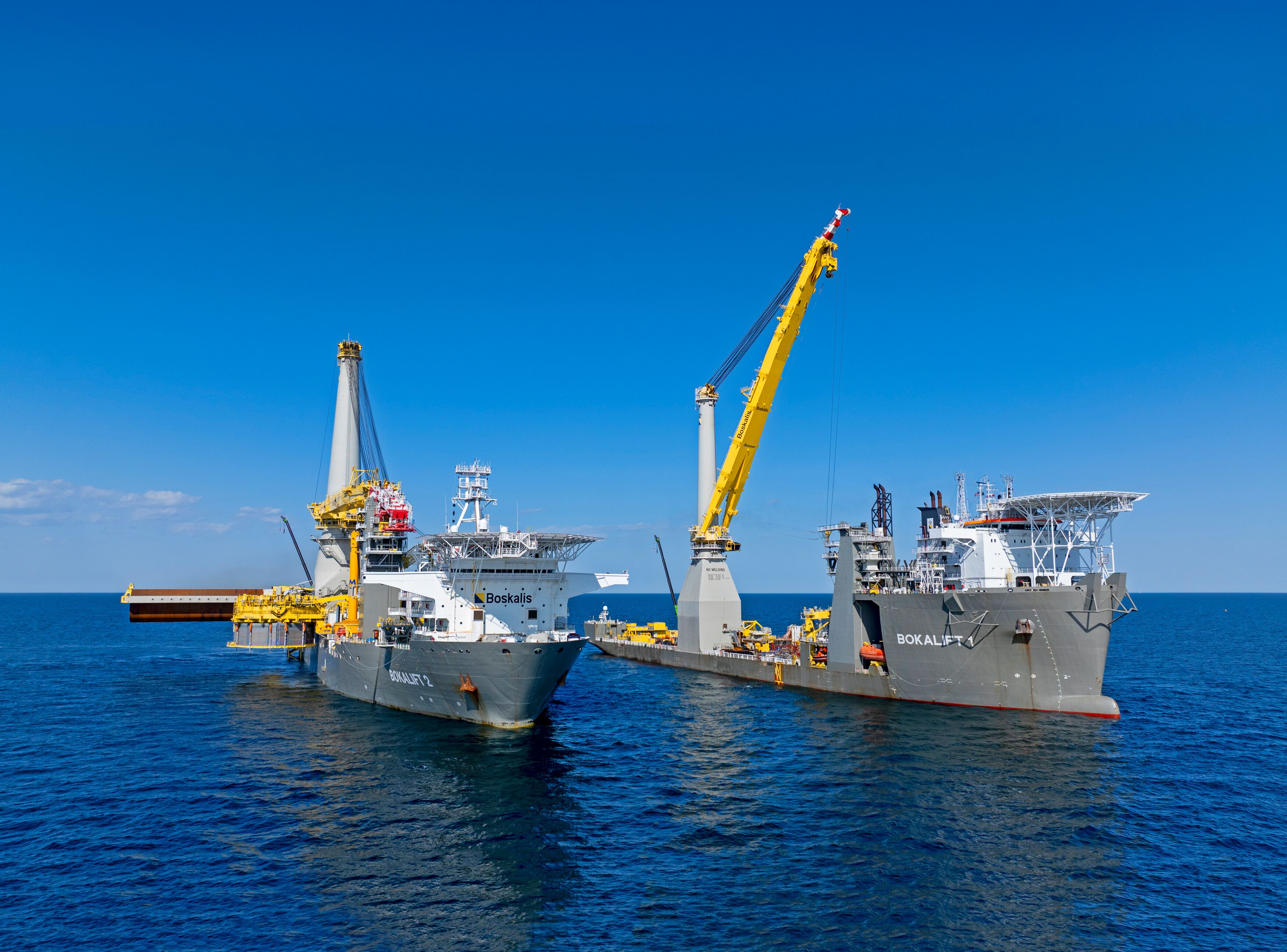 Bokalift 1 與 Bokalift 2 執行離岸風場水下基礎的運輸與安裝作業。圖片來源:Boskalis