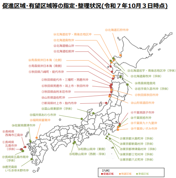 此外,政府亦公布三處新「預備區域」(Preparatory Zone),包括千葉縣旭市外海、計畫採用浮式風機技術的長崎縣五島列島,以及鹿兒島縣串木野市外海。