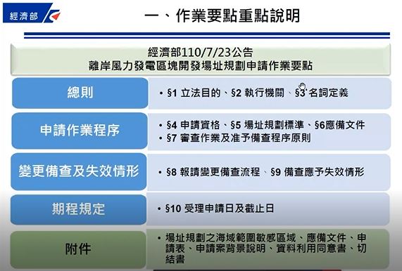 經濟部能源局今(2)日召開「離岸風力發電區塊開發場址規劃申請作業要點」線上說明會,向開發商說明案件審查相關作業流程。區塊開發相關申請之受理申請日為經濟部發布要點日(8月19日)受理。在申請截止日,在原先的說明會中預告為明年八月,但在本次說明會中,經濟部表示依照離岸風電區塊開發政策推動情形,「另行公告」。