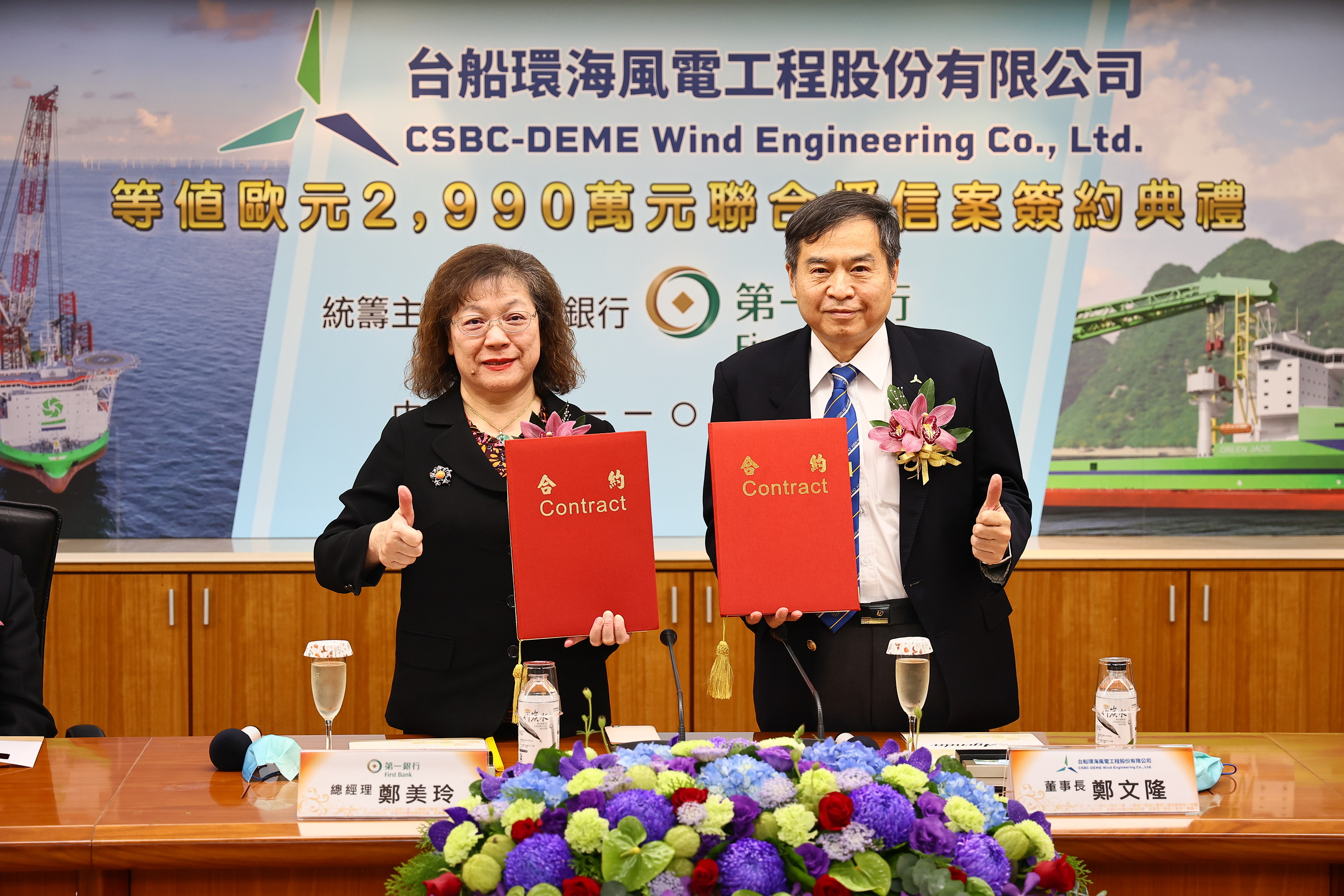 台船環海與第一銀行特別假第一銀行總行大樓舉行簽約儀式,典禮簡單而隆重,由第一銀行總經理鄭美玲以及台船環海公司董事長鄭文隆共同主持,現場除了主辦銀行第一銀行,另有兆豐、華南、土銀、合庫、彰銀及台企銀等六家參貸銀行代表出席,共同見證台灣離岸風電產業融資在地化的珍貴時刻。