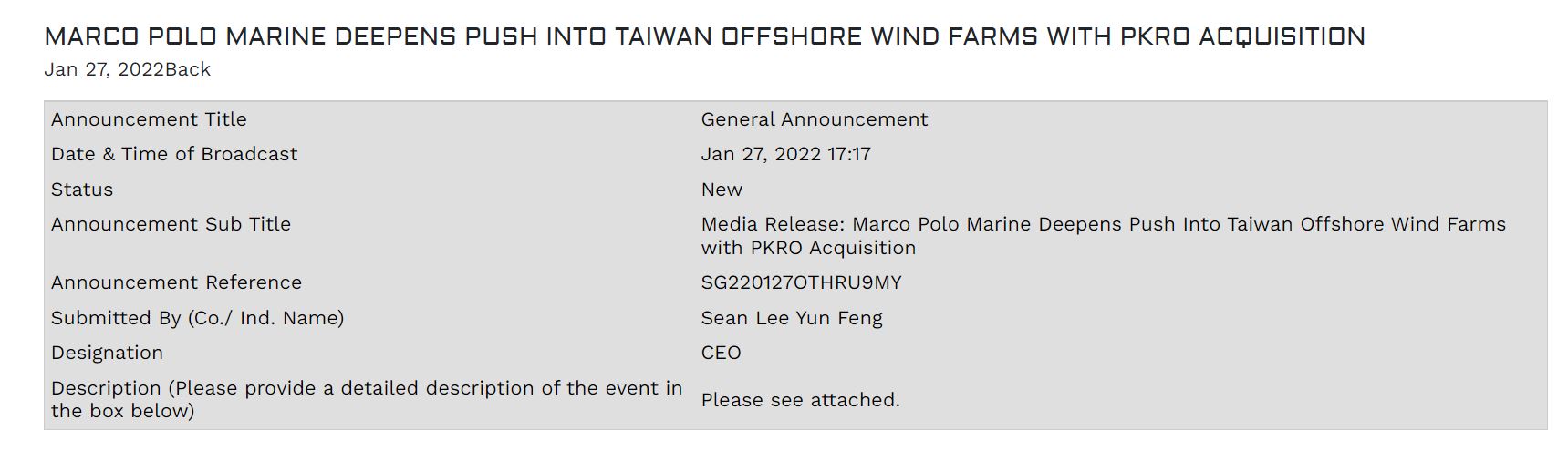 新加坡商海上船東和運營商馬可波羅海業(Marco Polo Marine,MPM)透過收購合資企業保時嘉里潔能(POSH Kerry Renewables,PKR)旗下的嘉時航運股份有限公司(PKR Offshore,PKRO),使 MPM 在成長中的台灣離岸風電市場,有更穩固的立足點。