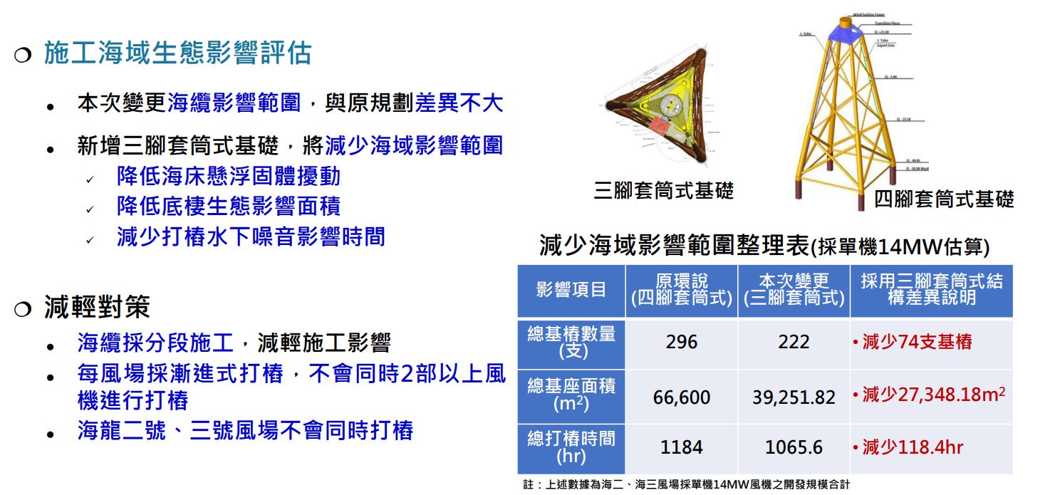 變更後,三腳套筒基礎可減少74支基樁數量,減少總基座面積27,348平方公尺,並增加基樁貫入深度5公尺,打樁時間減少118.4小時,整體海域施工減少4個月。海上變電站減少為2座後,每座變電站之總基座面積不變,上部結構體積將增加2倍,基樁直徑增加0.6至0.9公尺。
