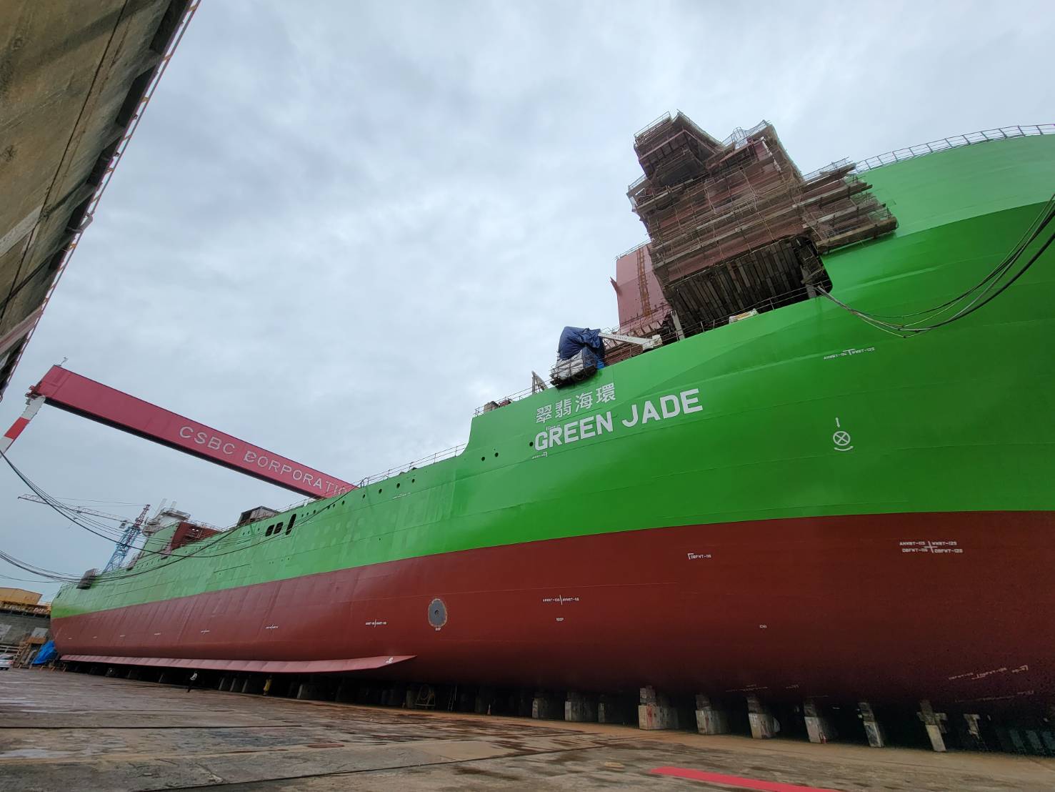 臺灣首艘全迴旋大型浮吊船「環海翡翠輪」(Green Jade),於今(3)日上午在台灣國際造船股份有限公司(下稱:台船公司)高雄廠區舉行下水典禮。典禮由台船公司董事長鄭文隆、台船環海執行長 Marco Kanaar 主持,行政院蘇貞昌院長、高雄市陳其邁市長、經濟部王美花部長,以及中能離岸風場、海龍離岸風場等風場開發商及相關廠商到場觀禮。