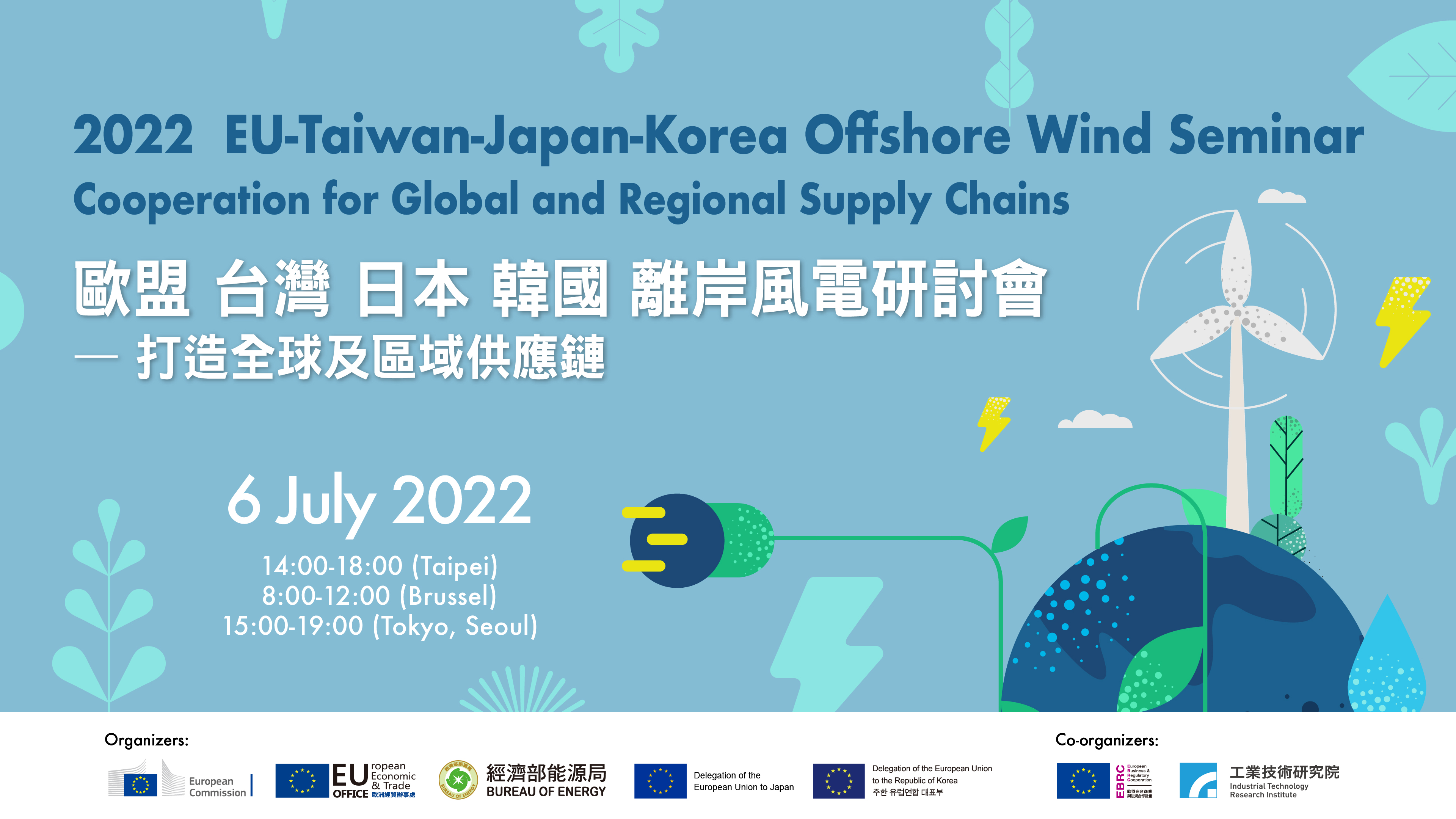由歐洲聯盟委員會(European Commission)、歐洲經貿辦事處(European Economic and Trade Office)及能源局共同主辦之《歐盟-台灣-日本-韓國離岸風電研討會:打造全球及區域供應鏈》於 7 月 6 日盛大舉辦。