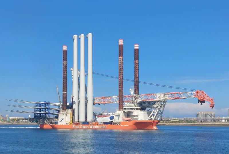挪威商 Fred. Olsen Windcarrier 8 日在其社群媒體平台發布旗下自升式風機安裝平台船 Bold Tern 工作照,顯示該船已裝載彰芳西島離岸風場之首批風機組件並駛離臺中港。