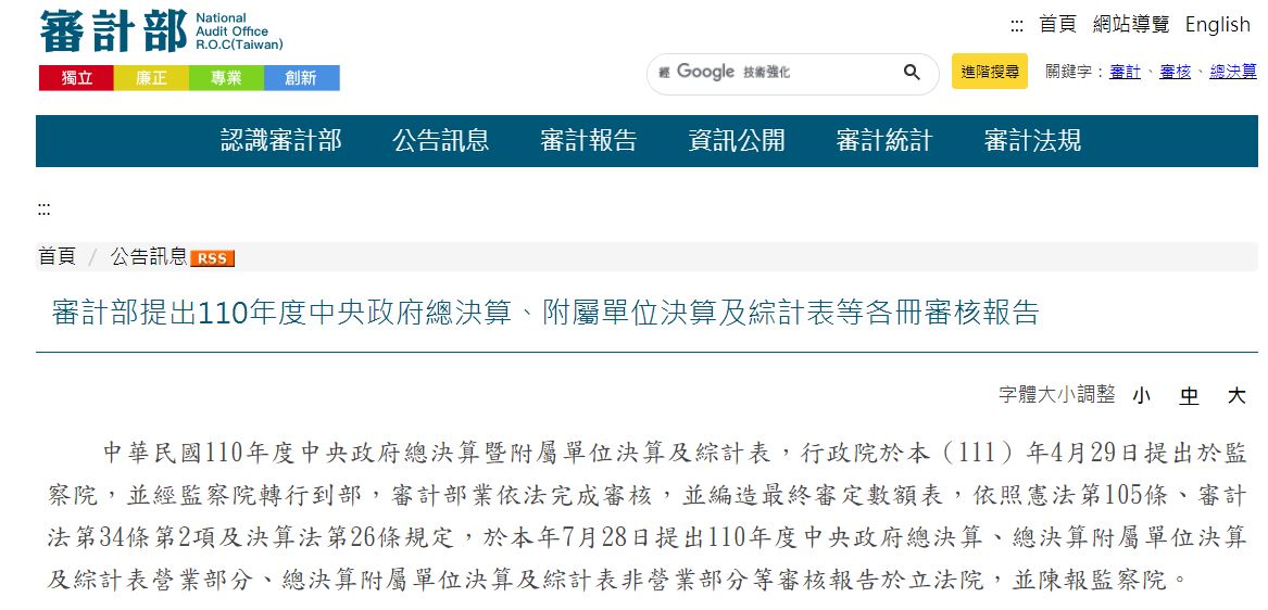 審計部於 7 月 28 日提出 110 年度中央政府總決算、總決算附屬單位決算及綜計表營業部分、總決算附屬單位決算及綜計表非營業部分等審核報告。