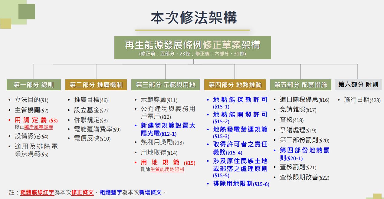 - 地熱發電:明定地熱能探勘、開發、營運等階段之相關規範,並由中央主導申設程序,建立地熱加速開發之友善法制環境
