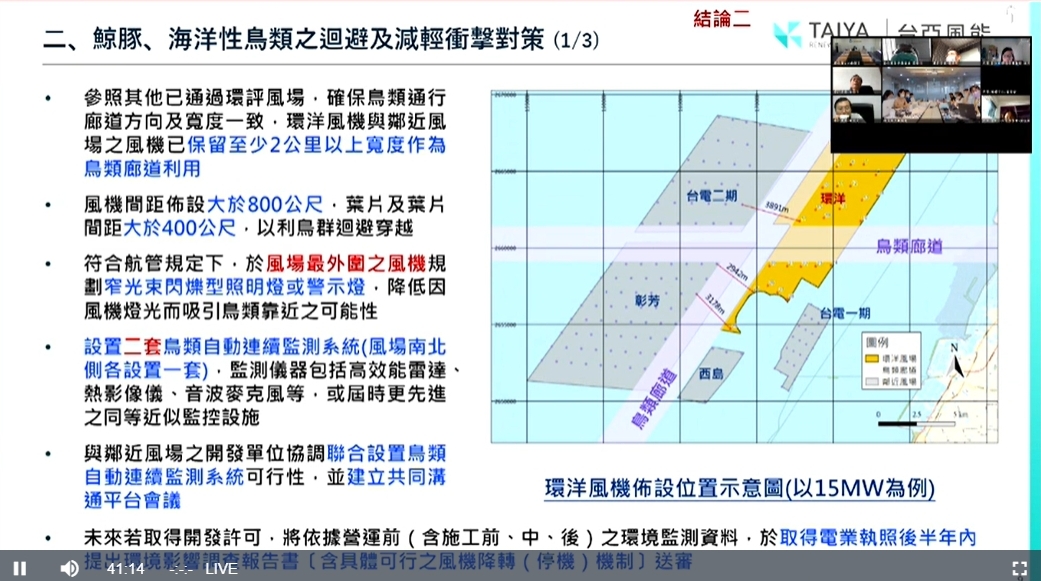 環洋風力籌備處於會議中承諾:將於風場南北兩側設置兩套鳥類自動連續監測系統,雷達偵測範圍涵蓋風場內所有風機、執行海域水質重金屬監測、在地質條件允許下,優先使用負壓式沉箱基礎、與彰化縣政府監測平台共同進行養殖監測、風機佈設時再評估防止鳥類誤入措施、建立噪音監控聯繫協調機制。