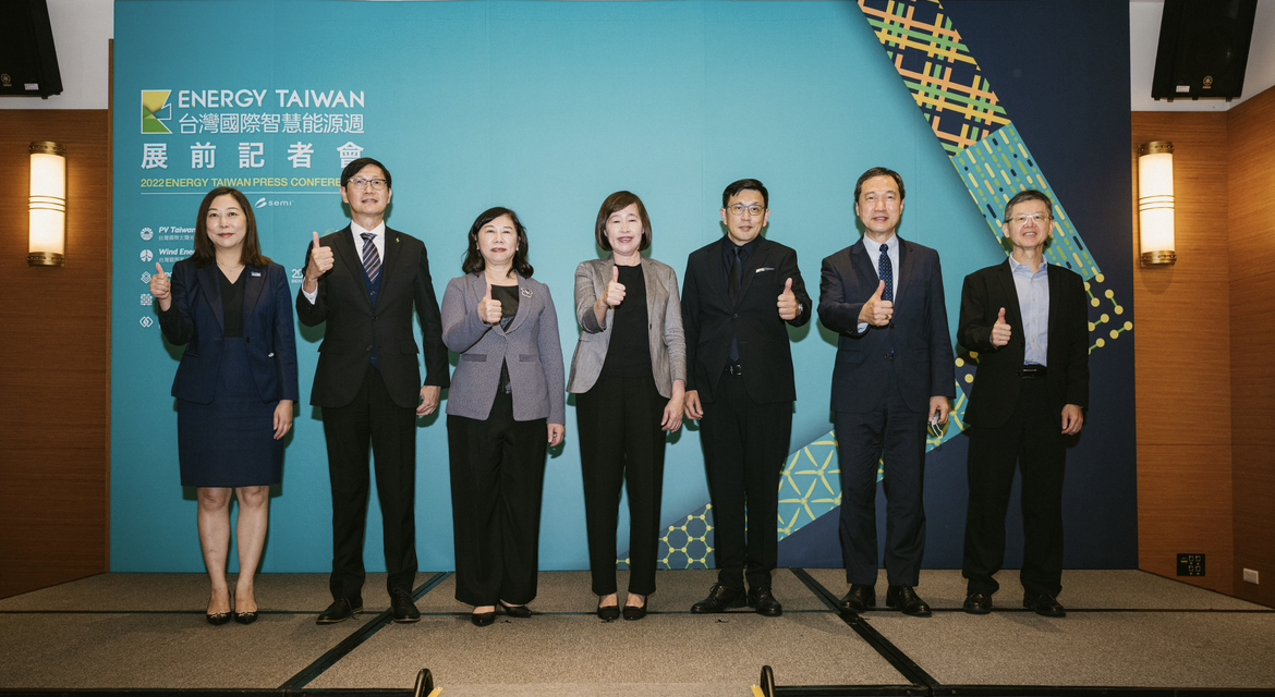 2022 台灣國際智慧能源週前記者會,左起:沃旭能源股份有限公司董事長汪欣潔、台灣電力公司副總經理徐造華、外貿協會副秘書長李惠玲、國家發展委員會副主任委員高仙桂、SEMI全球行銷長暨台灣區總裁曹世綸、聯合再生能源太陽能事業總經理沈維鈞、台達電子能源系統解決方案事業處資深處長艾祖華。圖片來源:台灣國際智慧能源週