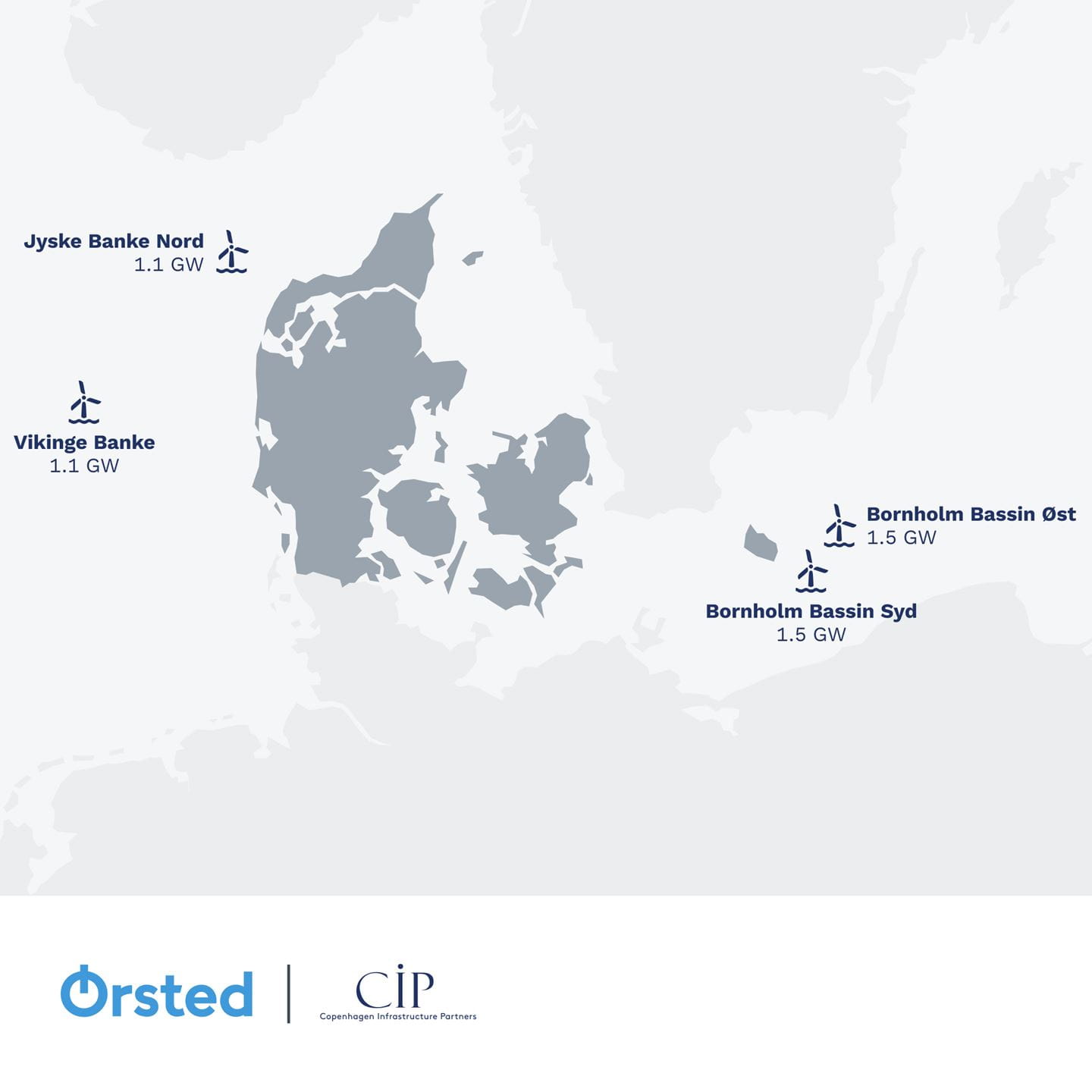 沃旭與 CIP 的合作將會採用 50/50 的均分佔比,並根據丹麥的公開申請計畫(open-door scheme)開發離岸風電專案,包含位在北海的 Vikinge Banke(1.1 GW)、Jyske Banke Nord(1.1 GW)風場,以及位在波羅地海的 Bornholm Bassin Syd(1.5 GW)、Bornholm Basin Øst(1.5 GW)風場。
