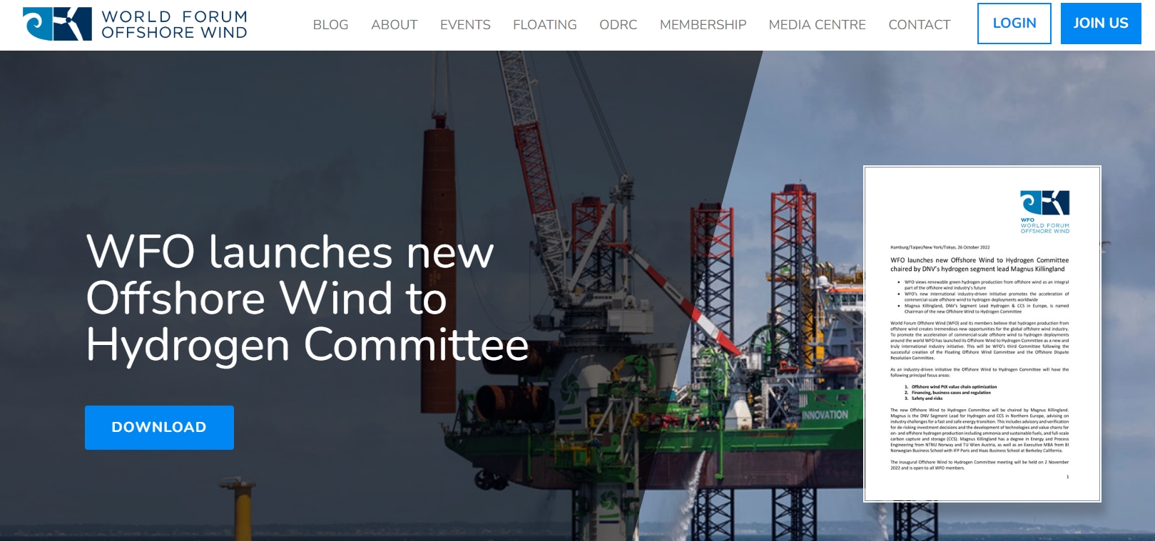 WFO 及其成員相信以離岸風能產製氫氣將為全球離岸風電產業帶來全新商機。為加快全球商業規模離岸風電產製氫氣的部署速度,WFO以國際產業倡議布局、新創「離岸風能產製綠氫委員會」。這將是 WFO 繼浮動式風能委員會(Floating Offshore Wind Committee)及海上爭端解決委員會(Offshore Dispute Resolution Committee)成功設立後的第三個委員會。