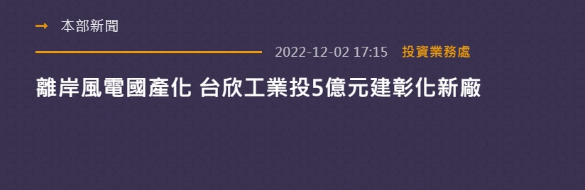 位於彰化芳苑的台欣工業具備先進焊接工藝技術,主要營業項目有壓力容器與離岸風力發電水下基礎製造。由於臺灣西海岸有發展離岸風電之優勢,且政府大力推動綠電,為此計劃投資近 5 億元在彰化縣芳苑鄉興建廠房,擴增基樁(Pin Pile)與管架式水下基礎之腳柱(Jacket Leg)智慧化產線,同時導入 SMES 管理系統,可即時進行追蹤管理與調整。在全球重視氣候變遷及永續發展議題時,藉此強化臺灣國內風電產業鏈。
