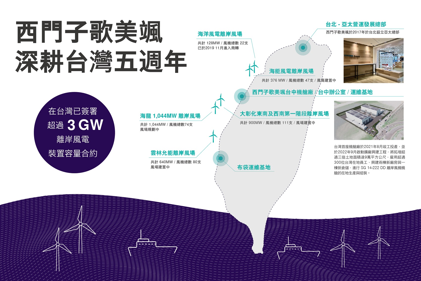 西門子歌美颯在台灣目前已簽屬 3 GW 裝置容量合約,建置中的風場包含允能(640 MW)、海能(376 MW)、大彰化東南與西南第一階段離岸風場(900 MW),全力協助政府邁向 2050 淨零碳排目標。