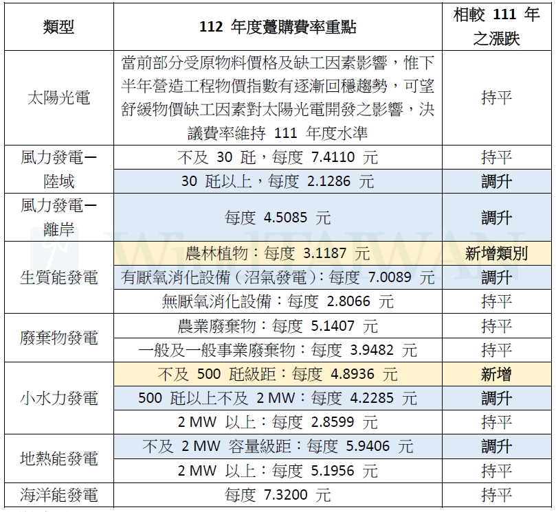 經濟部業已完成「中華民國112年度再生能源電能躉購費率及其計算公式」之審定作業,並於 112 年 1 月 6 日正式公告,與 111 年度相比,整體而言,大部分費率維持(如太陽光電、陸域風力不及 30 瓩級距、生質能無厭氧消化設備、廢棄物、小水力 2 MW 以上級距、地熱 2 MW 以上級距、海洋能)、部分提升(如陸域風力 30 瓩以上級距、離岸風力、生質能有厭氧消化設備、地熱不及 2 MW 級距)或增加類別或費率級距(如農林植物、小水力不及 500 瓩 級距、小水力 500 瓩以上不及 2 MW 級距),以鼓勵各類再生能源的發展。