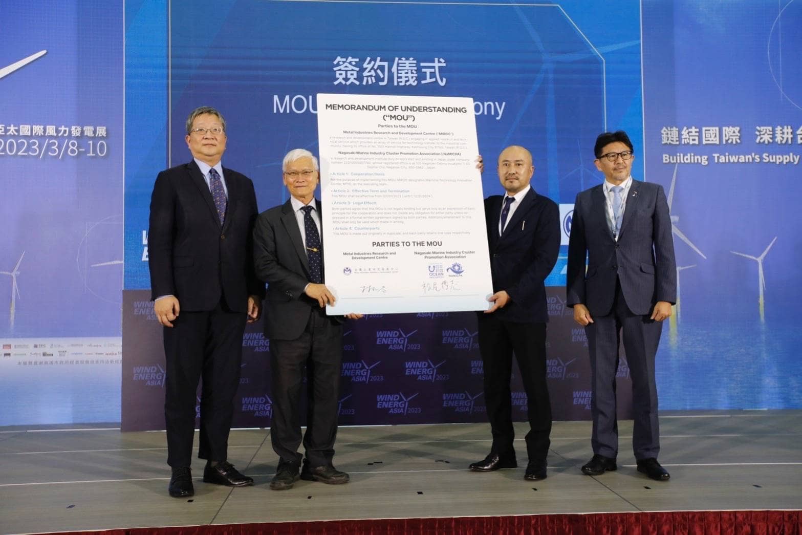 於 3 月 8 日亞太風電展開幕典禮上,金屬中心與日本「長崎海事工業群落促進協會(NaMICPA)」簽署合作備忘錄(MOU),將共同規劃離岸風電產業國際交流課程,讓來自日本各大學年輕學子,跨海學習台灣風電發展現況,在台灣完成各項訓練、取得各項國際證照,返回日本參與風電相關工作,促進兩國未來產業發展的密切合作。