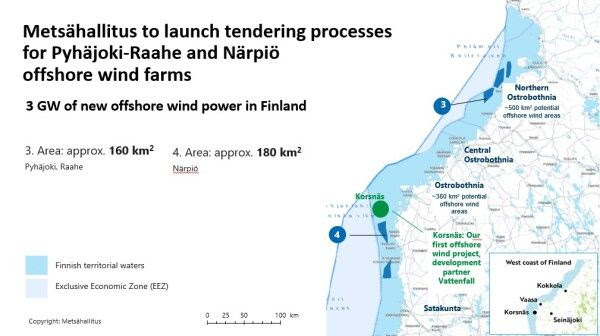 負責管理芬蘭國有土地和水域的 Metsahallitus 公司表示,已開始為兩個離岸風電場專案的招標做準備,此專案總裝置容量約為 3 GW。