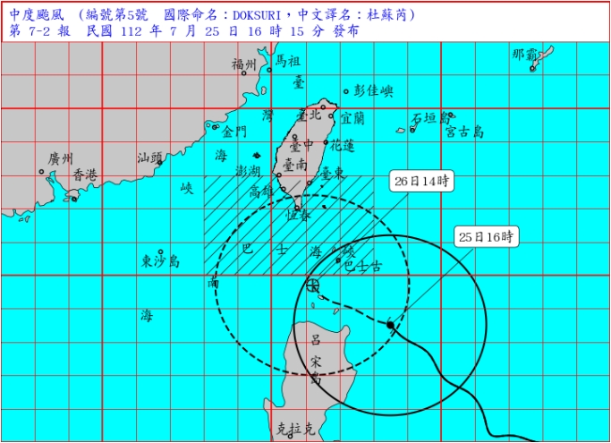 中央氣象局於今(25)日下午 2 點 30 分針對杜蘇芮颱風發布海上陸上颱風警報,目前氣象局針對屏東、恆春半島,以及巴士海峽、臺灣東南部海面(含蘭嶼、綠島)、臺灣海峽南部、東沙島海面航行及作業船隻提出應嚴加戒備的提醒。