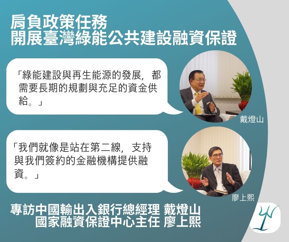 目前臺灣推行的能源轉型、綠能建設政策,皆需投入大量資金。讓金融機構願意投注資金到產業中,以及讓企業能夠從市場中取得所需的資金,可說是影響綠能發展的關鍵。因此國發會於 2020 年核定「國家融資保證機制推動方案」,輸銀成立「國家融資保證中心」(下稱融保中心),負責執行本項任務。戴燈山說:「綠能建設某些特定項目具有所需要的專業人才多、資金大、時間長的特點,當其開發完成後,在未來的現金流是很穩定的,但由於期間也拉得很長,所以透過國家融資保證機制減輕銀行貸款時所承擔的風險,讓企業能夠確實從金融市場上取得所需的資金。」