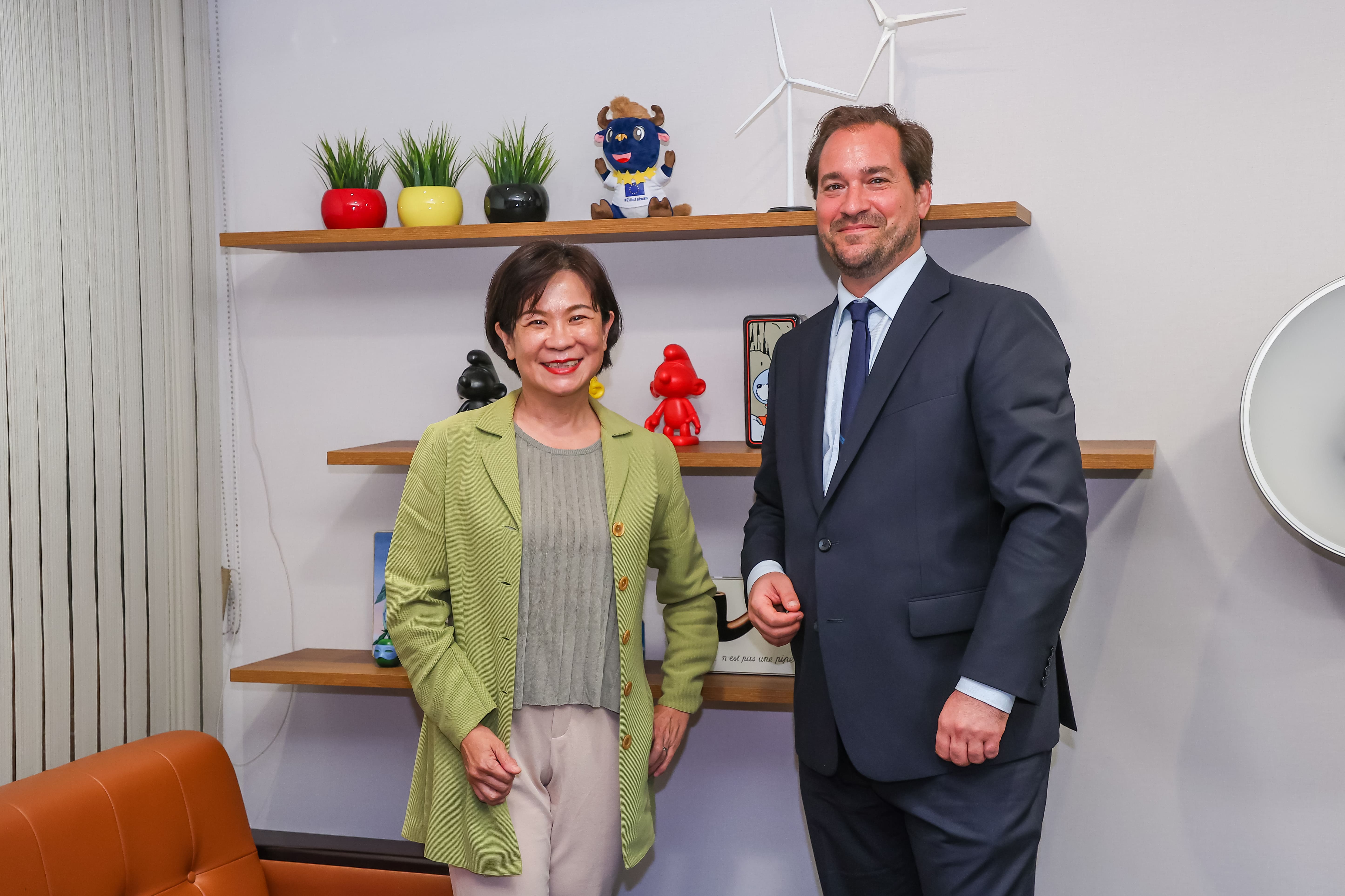 左起比利時台北辦事處法蘭德斯經貿組主管吳良鈺、比利時辦事處處長馬撤,歡迎各界於能源週來「比利時國家館」走走。圖片來源:WindTAIWAN