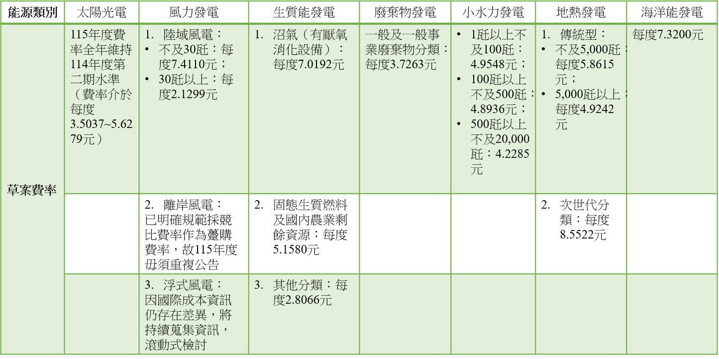 在費率草案部分,太陽光電將維持 114 年第二期費率;陸域風場依容量為每度 7.4110 元及 2.1299 元;生質能依分類介於每度 2.8066 至 7.0192 元;小水力、地熱及海洋能也依成本調整。離岸風電因已採競比制度,草案中不另公告費率。