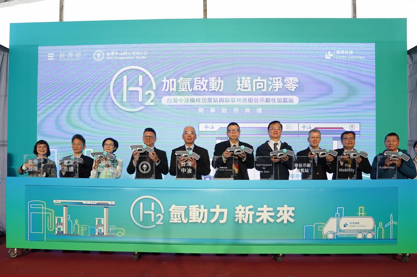 台灣主要工業氣體廠商 – 聯華林德氣體攜手台灣中油,於12月11日假中油楠梓加氫站,宣告聯華林德台南樹谷示範性加氫站、中油高雄楠梓加氫站正式啟用。(聯華林德提供)