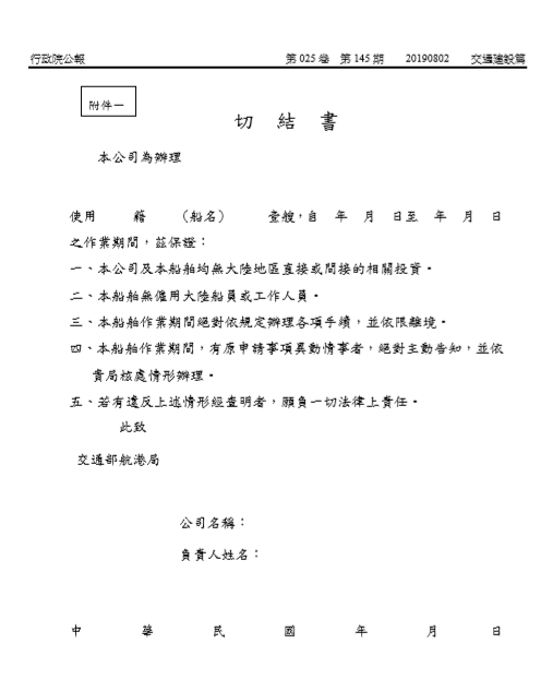 1、船舶國籍證書。 2、船舶國際噸位證書(ITC)。 3、載重線證書(ILLC)。 4、貨船安全構造證書(SC)。 5、貨船安全設備證書(SE)。 6、貨船安全無線電證書(SR)。 7、國際油污防止證書(IOPP)。 8、國際水污防止證書(ISPP)。 9、國際空氣污防止證書(IAPP)。 10、國際防污系統證書(AFS)。 11、安全管理證書(SMC)。 12、符合文件證書(DOC)。 13、國際船舶保全證書(ISSC)。 14、船舶連續概要紀錄(CSR)。 15、船東互保責任險(P&I)。 16、船員名單、船舶彩色照片。 17、從事離岸風力發電船舶依第七點規定另具備相關證書。 (九) 申請人就本申請案提出以下船舶切結證明(切結書格式如附件一): 1、無大陸資本及大陸船員或工作人員。 2、特許期間遵照規定辦理各項手續並依限離境。 四、審查作業程序 (一) 大陸地區建造且經「國安聯合審查結果」確認無國安疑慮者: 1、申請人檢附前點文件。 2、審查合格後,本局核發同意函。 (二) 大陸地區建造且經「國安聯合審查結果」需辦理抵港檢查者: 1、 由目的事業主管機關依行政院頒布「兩岸交流安全跨部會協調審查機制運作流程圖」辦 理國安審查後,檢附前點文件。 2、審查合格後,本局核發航行至國際商港或我國公告小三通港口之同意函。 3、 工作船抵達港口後,依國安聯合審查通過之國安管制計畫辦理檢查並製作紀錄,由目的 事業主管機關函送本局檢查紀錄,檢查合格者始得作業;檢查不合格者,本局通知該船 限期駛離臺灣地區水域。 五、 經濟部國際貿易局公告為大陸物品不准輸入之船舶(MW0),應檢附該局專案許可輸入文件 及本局同意函向財政部關務署報關進口後,始得作業。 六、 核准來臺作業事項於作業期間內發生異動,申請人應主動向本局提出書面說明,並依本局核 處情形辦理。 七、 非本國籍工作船之工作範圍為從事離岸風力發電工程建置、維修及除役者,應依下列規定辦 理: (一) 應取得主管機關委託之驗船機構核發之船級證書。 (二) 申請人依第三點檢附文件申請。許可期依經濟部出具船舶使用同意文件或展期文件載明之 期限核定。