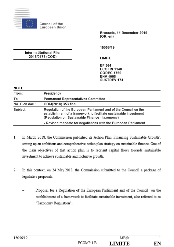 參考資料: 1. The European Green Deal 2. Regulation of the European Parliament and of the Council on the establishment of a framework to facilitate sustainable investment (Regulation on Sustainable Finance - taxonomy) 3. ‘Do no harm’: Nuclear squeezed out of EU green finance scheme https://www.euractiv.com/section/energy-environment/news/do-no-harm-nuclear-squeezed-out-of-eu-green-finance-scheme/ 4. EU seals deal on green finance in breakthrough for climate goals https://www.euractiv.com/section/energy-environment/news/eu-seals-deal-on-green-finance-in-breakthrough-for-climate-goals/