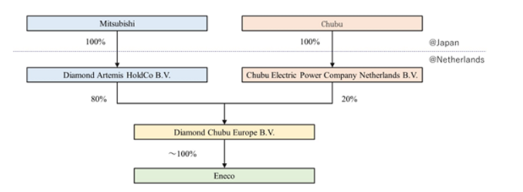 兩家日本企業透過合資公司Diamond Chubu Europe B.V. 收購Eneco 100%股權,金額達41億歐元(約5000億日圓)。