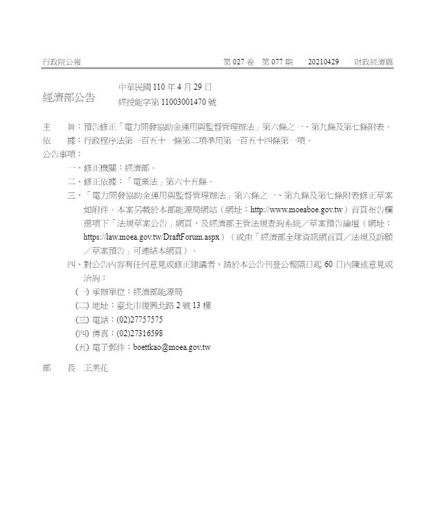 經濟部於2021年4月29日公告,預告將依據《電業法》第六十五條修正「電力開發協助金運用與監督管理辦法」第六條之一、九條及第七條附表。