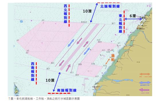 隨著第三階段區塊開發第三次 公聽會於 2021 年 5 月 11 日 召開之後,航道議題隨著風場劃設 一道浮上檯面。一般俗稱的航道, 包含海洋航行航線及內陸水域航行 航線,此爭議乃是基於臺灣海峽彰 化以北,臺中、苗栗及新竹海域。