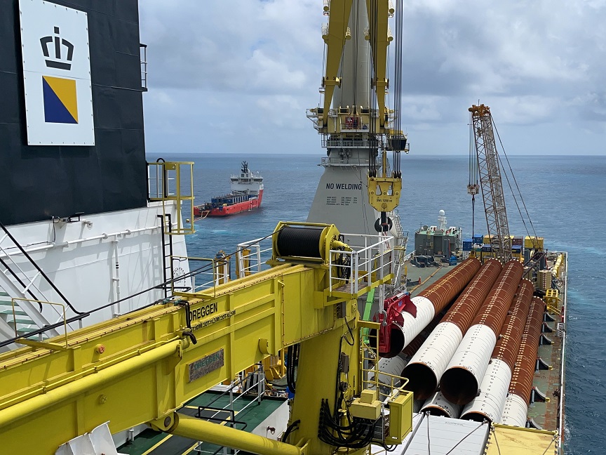 工程船Bokalift 1自6月28日起開始執行施工任務,雖歷經全國第三級疫情警戒邊境嚴管措施以及接連而來的颱風,但彰芳西島團隊與伯威海事仍竭盡全力展現最高專業應變與施工彈性,克服難關完成目標。