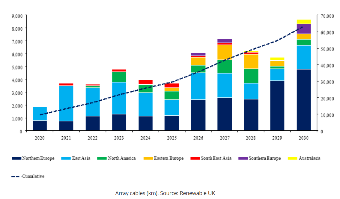 此份報告指出,直到2030年底,全球將安裝超過63,200公里的陣列電纜,超過2020年底安裝的9,700公里。
