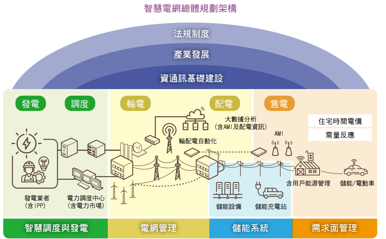 而為確保發、輸、配電系統的操作安全及整體電力系統穩定可靠,台電以中央調度中心(CDCC)、區域調度中心(ADCC)與配電調度中心(DDCC)建構三階層完整電源及電網監控能力,分秒達成電力供需平衡。台電同時也持續發展先進配電管理系統(ADMS)、饋線自動化系統、智慧電表(AMI)等技術,並於金門地區建置可0.2秒內即刻供電的鋰電池儲能系統,及可大量儲存再生能源至需要時段使用的鈉硫電池儲能系統,成為智慧電網技術的整合驗證場域。