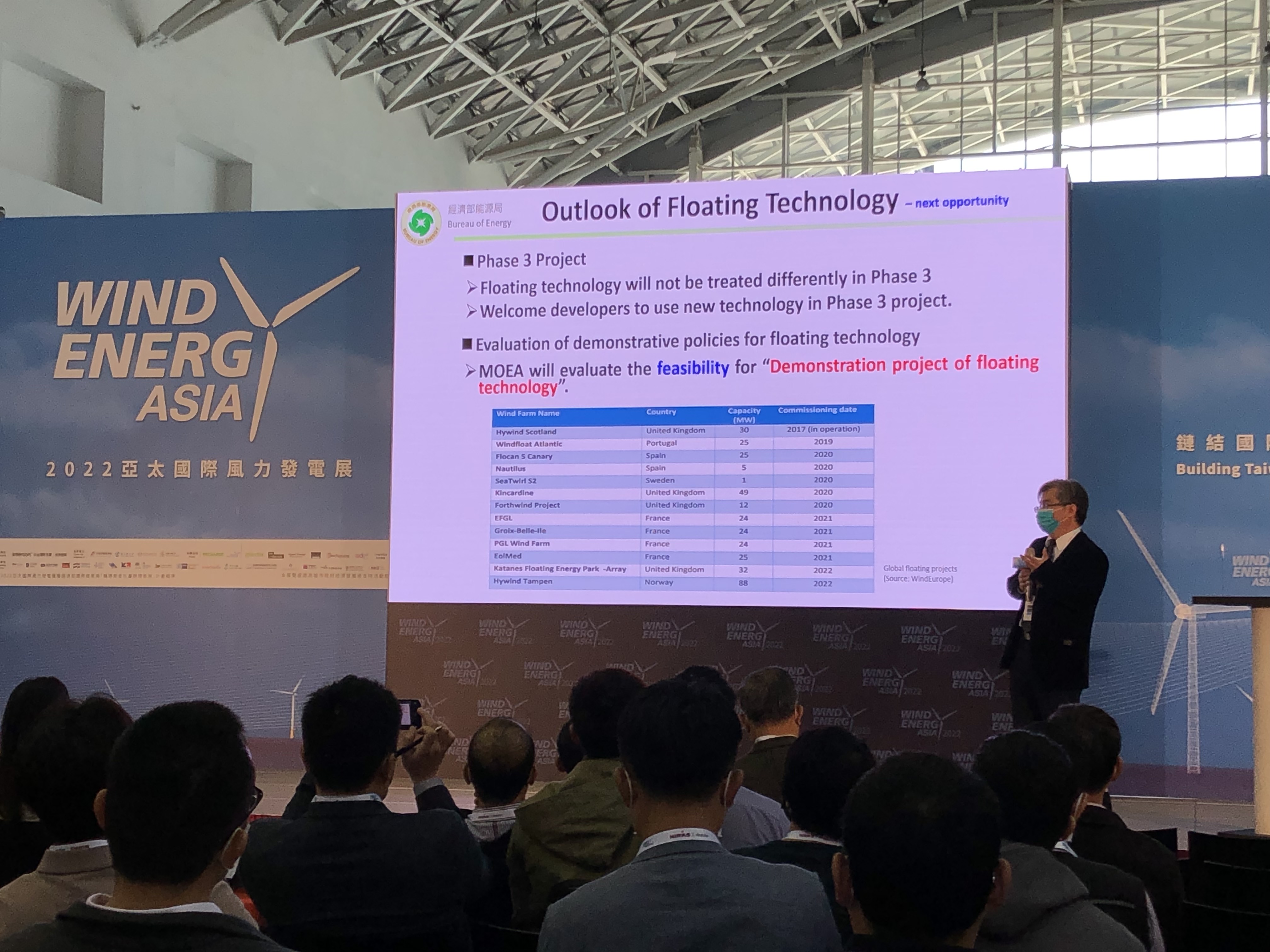 而針對 2 月由上緯新能源與金屬工業研究發展中心舉辦的「浮式風機本土產業鏈推動交流會」中,產學界大力倡議政府挹注資源的「浮動式技術示範風場」,陳崇憲也表示,經濟部將會進行進一步的可行性評估,研議是否將進行浮式示範風場計畫。在歐洲已有十幾座浮動式風場完成測試,其中 Hywind Scotland 更是在 2017 年商轉後,連續數年拿下英國風場平均容量因數第一,可見離岸風電若要進一步往深水區開發、更妥善利用台灣海峽風場資源,浮動式水下基礎技術是必不可缺的一環。
