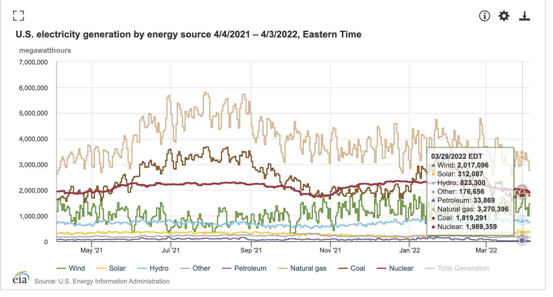 E&E News 記者 Ben Storrow 於 4 月 5 日在推特上指出,美國 3 月 29 日風能發電量超過 2000 吉瓦時(GWh)的電力,超越了核能與燃煤所產生的電量,僅次於天然氣位居第二大電力來源。而 EIA 也於隨後證實此數據。根據 EIA 數據,去(2021)年風能發電量次於天然氣、煤炭及核能,是美國第四大的電力來源,全年發電量接近 380 太瓦時(TWh,1TWh=1000GWh)。