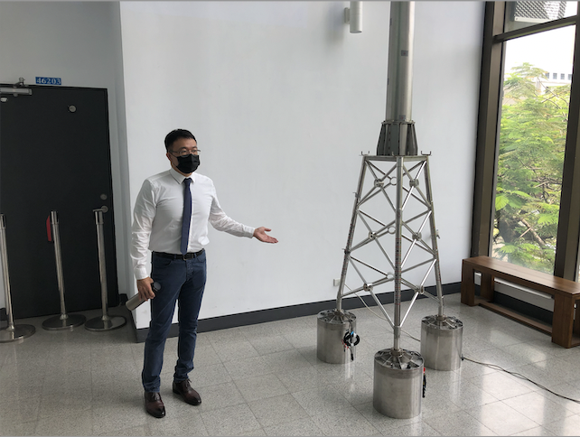 國立成功大學水利及海洋工程學系郭玉樹教授,以及沃旭能源攜手進行的「管架式負壓沉箱基礎之振動台試驗(SBJ shaking table test)」於 21 日在成大進行發表會。郭玉樹教授與 14 位大學部、研究所的學生,耗時數個月共同完成全球首座模擬 SBJ 的耐震測試。此次模擬測試採用高達 4 公尺,1:47 符合真實風機基礎比例的模型,利用在沉箱中抽水產生壓力差的技術,讓 SBJ 的三座沉箱一同緩緩地貫入模擬海床的砂箱中。郭玉樹教授說,此次模擬除了實驗也涉及數值模擬等不同領域,是需要跨領域合作的大型試驗。且單次實驗所需要的砂土重達 16 公噸,自去年 12 月起,共進行了 5 次動態試驗,規模相當龐大。