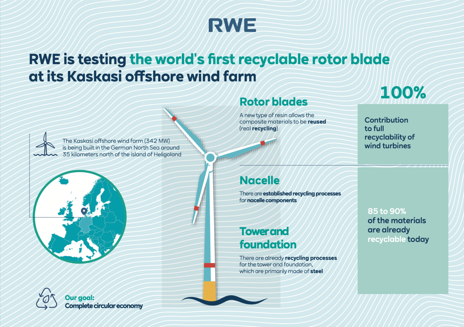 RWE 的 Kaskasi 風場由 38 座 SG 8.0-167 DD 風機組成,將有部分機組配備西門子歌美颯 B81 可回收葉片,葉片長度為 81 公尺。該風場位於德國北海黑爾戈蘭島(Heligoland)以北 35 公里處,裝置容量達 342 MW,每年可為多達 40 萬個德國家庭提供電力。