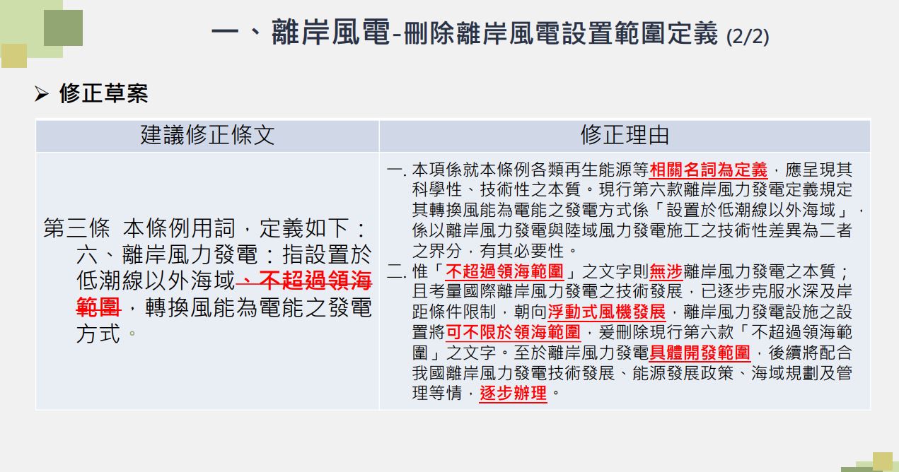 能源局表示,考量國際發展趨勢和技術施工的技術差異,目前技術發展已克服水深及離岸距離的條件限制,故此次修法將離岸風電名詞定義回歸技術性,修正「再生能源發展條例」第三條之條例用詞、第六項離岸風力發電「指設置於低潮線以外海域、不超過領海範圍,轉換風能為電能之發電方式。」,刪除「不超過領海範圍」,以擴大離岸風電設置場域、達成 2050 年淨零碳排目標。