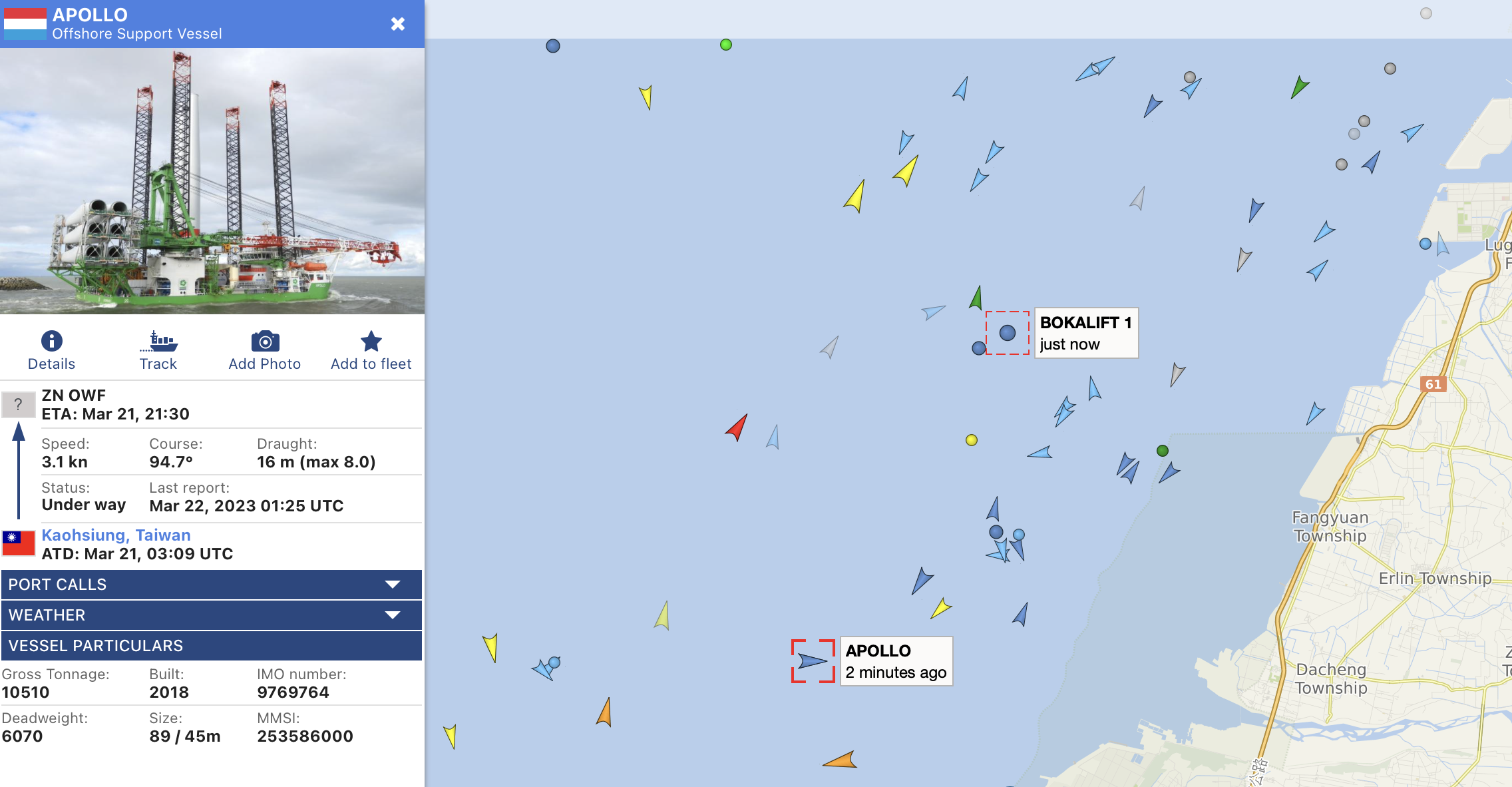 根據交通部航港局離岸風場施工資訊,中能風場預計於今(2023)年 3~10 月期間,由 DEME 旗下自升式平台船 Apollo 執行基樁運輸及安裝工程。而根據船舶即時動態資訊,Apollo 已於昨(21)日駛離高雄港前往中能風場,其餘工作船也已抵達風場海域。不遠處的彰芳風場海域,也可見到執行風場基礎運輸與安裝作業的重型起吊船 Bokalift 1。