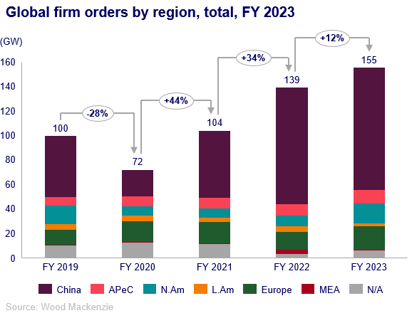Wood Mackenzie 的全球可再生能源研究副總經理 Luke Lewandowski 表示,2023 年第四季中國以外的訂單量創下歷史新高,北美地區全年訂單容量幾乎翻了一倍,這有助於西方市場的市場恢復,其年度訂單接單量同比增長了 26%。