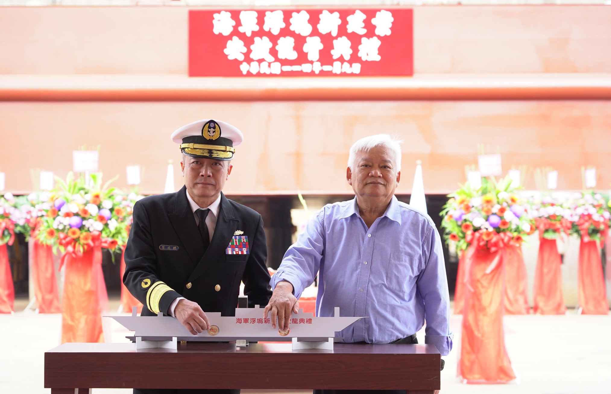 台船公司承造國防部海軍新建浮塢(ARD, Auxiliary Repair Dock),今天上午在高雄廠區舉行安放龍骨典禮,由台船公司副總經理顏聰輝與海軍保修指揮部指揮官葉瑞麟少將共同主持。