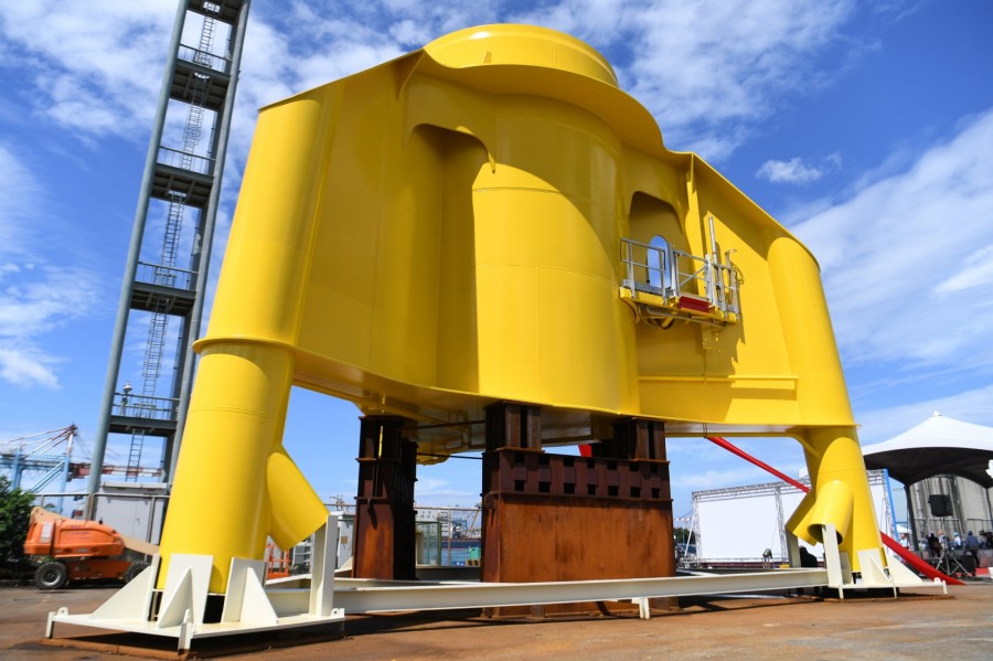 離岸風電開發商龍頭沃旭能源(Orsted)今(6)日於高雄港74號碼頭舉行與台灣中鋼集團興達海基共同打造支第一座MIT水下基礎轉接段原型公開記者會。沃旭能源亞太區總裁暨台灣董事長柏森文(Matthias Bausenwein)、中鋼公司總經理林弘男、興達海基董事長王亞洲以及在地20家下游供應商共同出席。政府方面,經濟部次長曾文生、工業局代表、能源局代表接出席。柏森文致詞時表示,沃旭能源對於向中央和相關機關所承諾的事項將一一實踐,在協助本土廠商製造水下基礎部分,預計將派駐十位在地員工,一起輔導未來參加製造的20家在地供應商,以符合國際標準生產。而興達海基董事長王亞洲則表示第一座完整的水下基礎預計在明年五月至六月間完成。