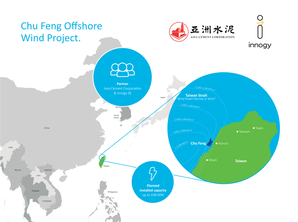 德國能源公司innogy與台灣遠東集團旗下亞洲水泥將攜手開發台灣新竹市西北沿岸的竹風離岸風場,風場裝置容量達448MW。