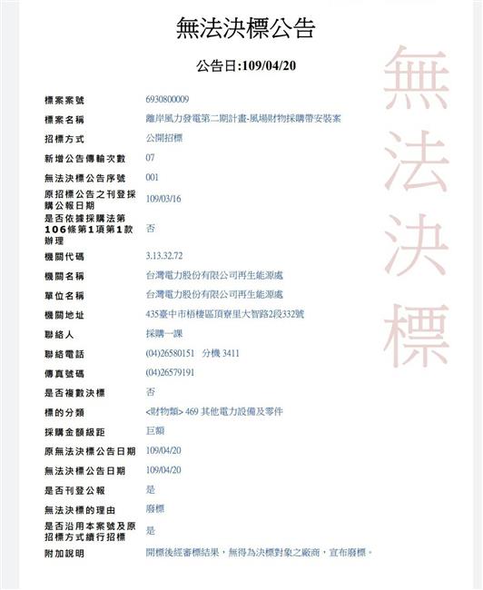 台電離岸風力發電第二期計畫-風場財務採購帶安裝案今公告「無法決標」,公告附加說明「開標後經審標結果,無得為決標對象之廠商,宣布廢標。」